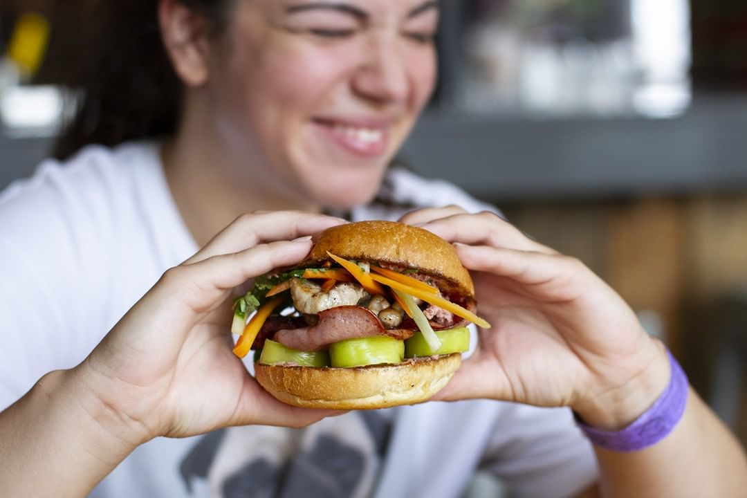 On n'oublie pas Québec! Ce burger au nom un peu funny est en fait le parfait mix entre nos envies végés et nos envies de viande. La boulette est composée de haricots et de champignons et elle est surmontée d'une tranche de lard Turlo. Le tout est agrément de cornichons maison et bio, d'une dijonnaise aux câpres et persil et de pousses de tournesol. Pour celles et ceux qui préfèrent avoir un burger sans viande, sachez qu'une option végé est disponible!