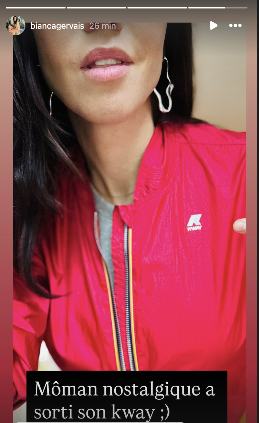 Elle a publié en story une photo d'elle portant un K-Way rose-rouge flashy des années 70-80-90, un clin d'œil rétro qui en fera sourire plus d'un.