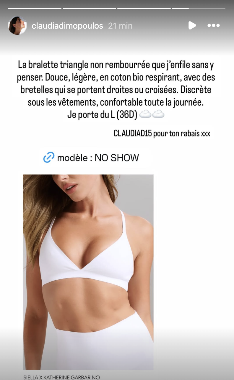 «La bralette triangle non rembourrée que j'enfile sans y penser. Douce, légère, en coton bio respirant, avec des bretelles qui se portent droites ou croisées. Discrète sous les vêtements, confortable toute la journée. Je porte du L (36D)», confie-t-elle, en glissant au passage un petit code promo afin que ses abonnées puissent profiter de leurs prochaines commandes à prix doux.