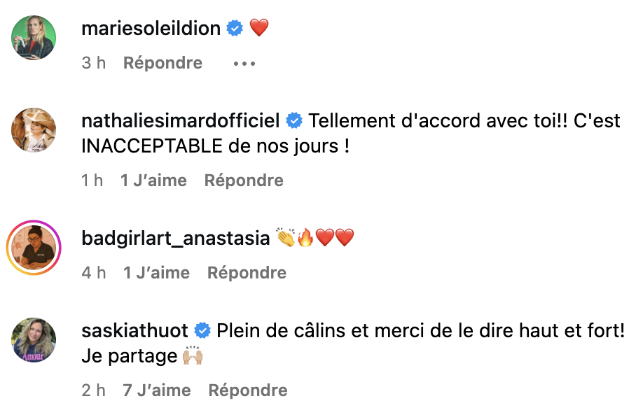 Dans les commentaires, plusieurs personnalités du milieu, dont Nathalie Simard et Saskia Thuot, ont tenu à appuyer la dénonciation de Debbie. Elles en ont profité pour lui témoigner une belle dose d'amour et de solidarité.