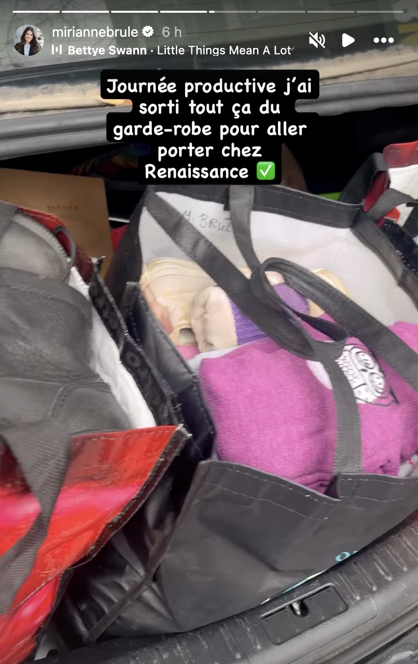 «Journée productive, j'ai sorti tout ça du garde-robe pour aller porter chez Renaissance», lance-t-elle, en légende d'une photo où l'on aperçoit ses sacs bien remplis, prêts à faire le bonheur de nouvelles personnes.